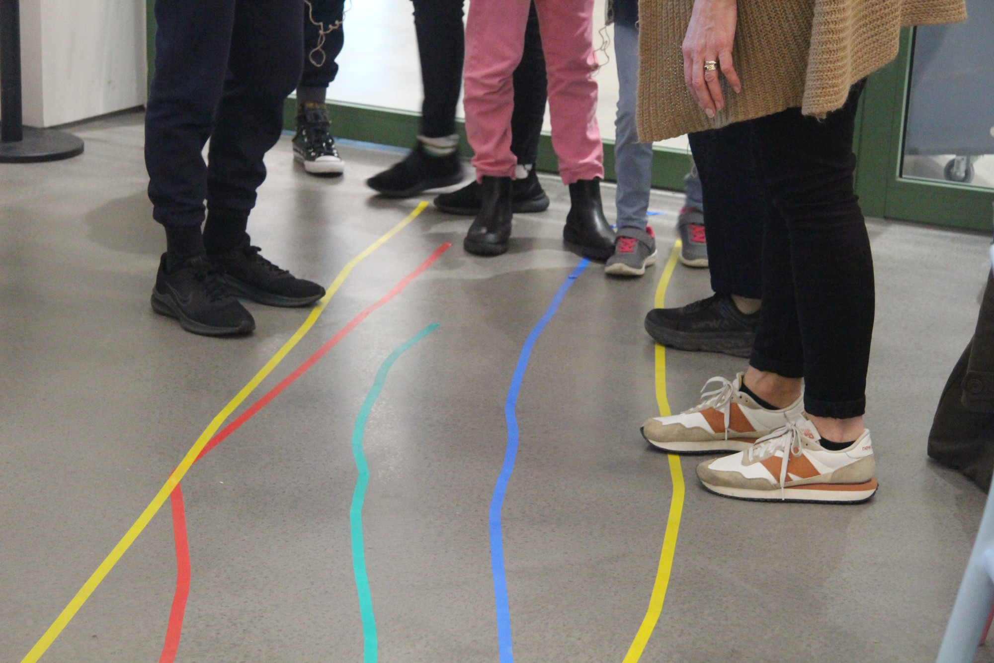 Another experiment was Eva's desire paths. She asked that everyone think about their favourite part of the exhibition, and choose a colour of tape. The students worked together to make a line with the tape that lead all the way from the door to a special place, marking it with an initial. It was cool to see where the lines of tape interacted, weaving and intersecting before splitting apart again. After they made their own paths, the students chose a different line to follow. Pretending they were tightropes, balancing and thinking about new ways to move, they didn't know where they would end up!