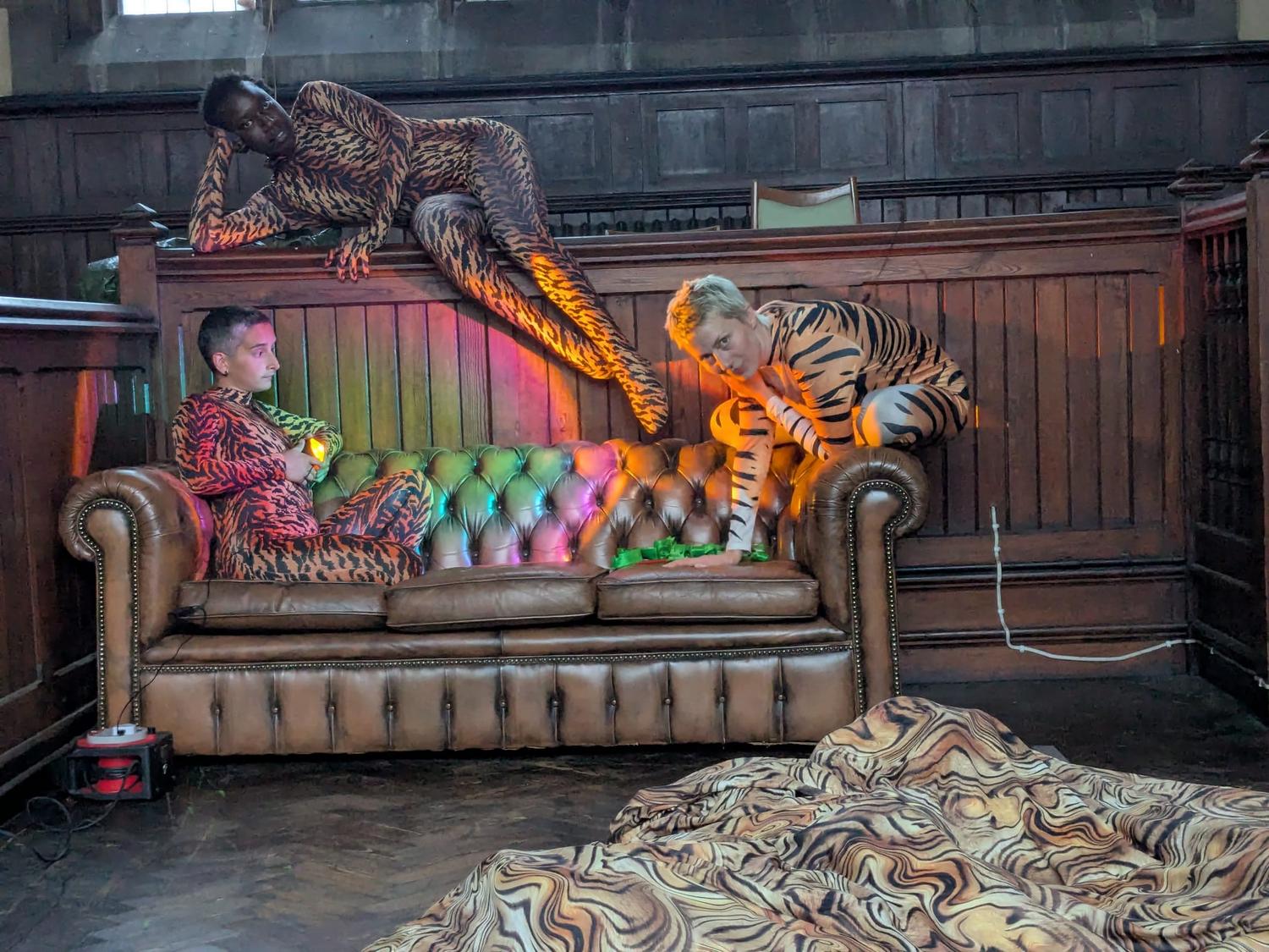 Morph suits are a central tool: worn in performance, they allow participants to blur boundaries between human and animal, slipping the grids of gender and species into something animorphic, cartoonish, and playful. The therapeutic beginnings of tiger helix - reaching inside yourself to reach out to others, finding queer forms of freedom amidst disaster - remains central to the process.